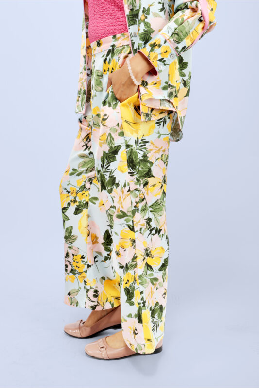 Women’s Sky Blue Floral Printed Satin Ankle-Length Trousers