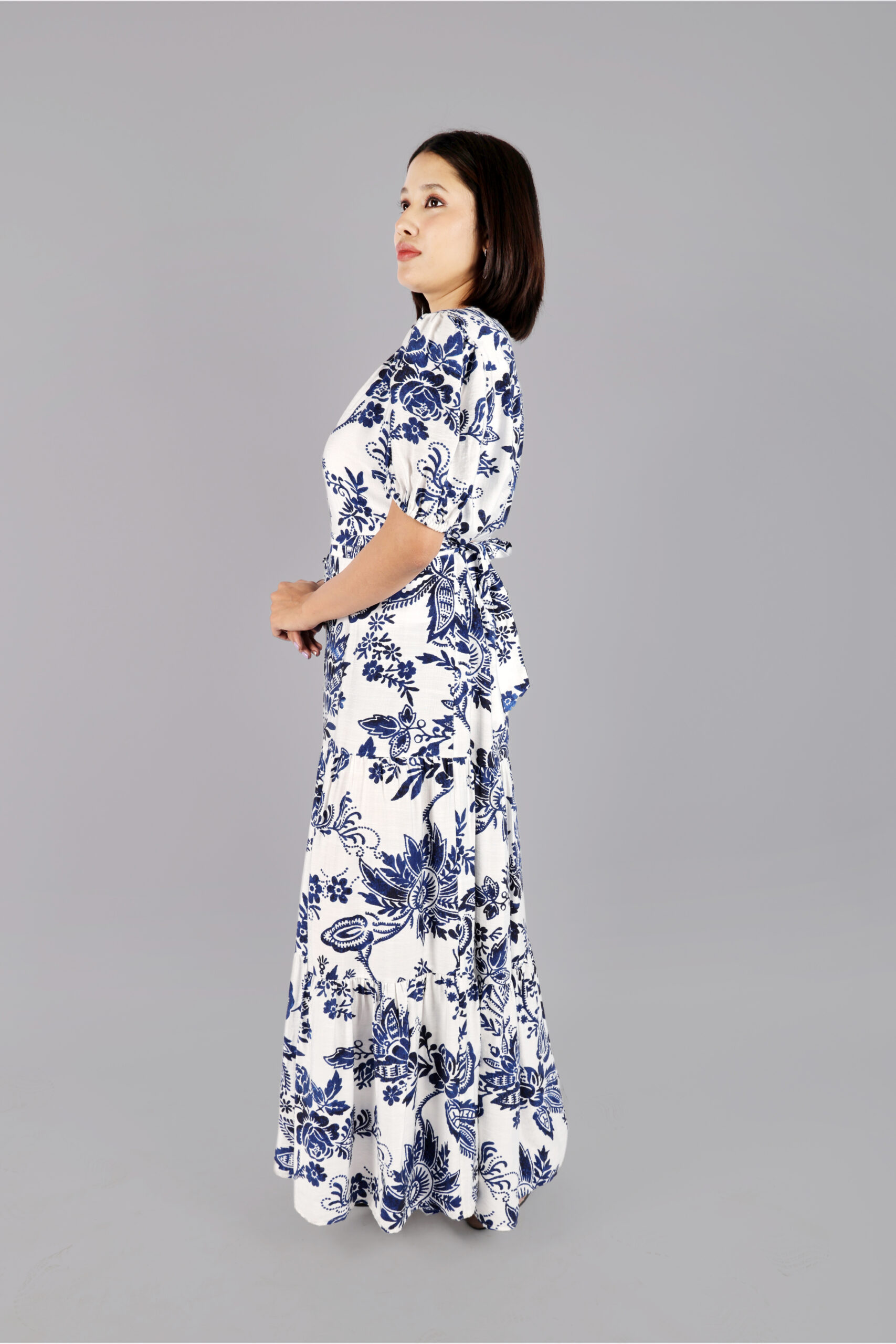 Embrace timeless elegance with this stunning white maxi dress, adorned with a bold navy blue floral print. Crafted from a breathable blend of 80% rayon and 20% linen, the fabric feels soft, lightweight, and perfect for all-day comfort.