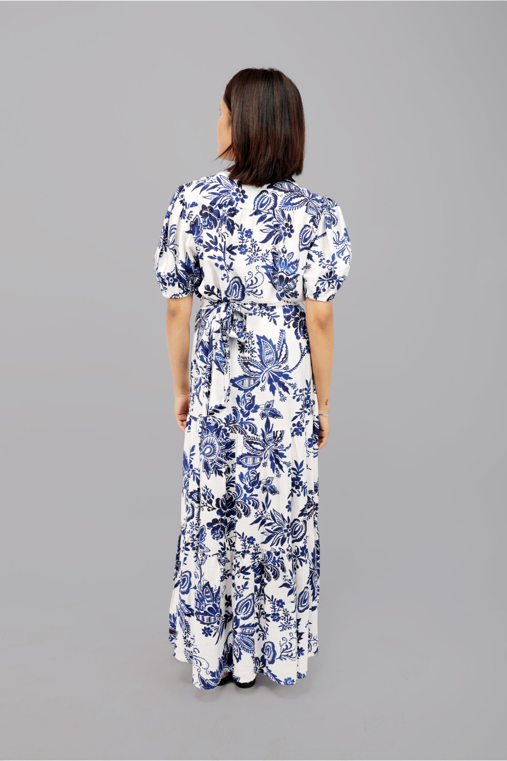 The classic floral pattern brings effortless charm, while its versatile design allows you to style it with flats for a laid-back daytime look or elevate it with heels for a polished evening ensemble. A must-have piece for a graceful and stylish wardrobe.