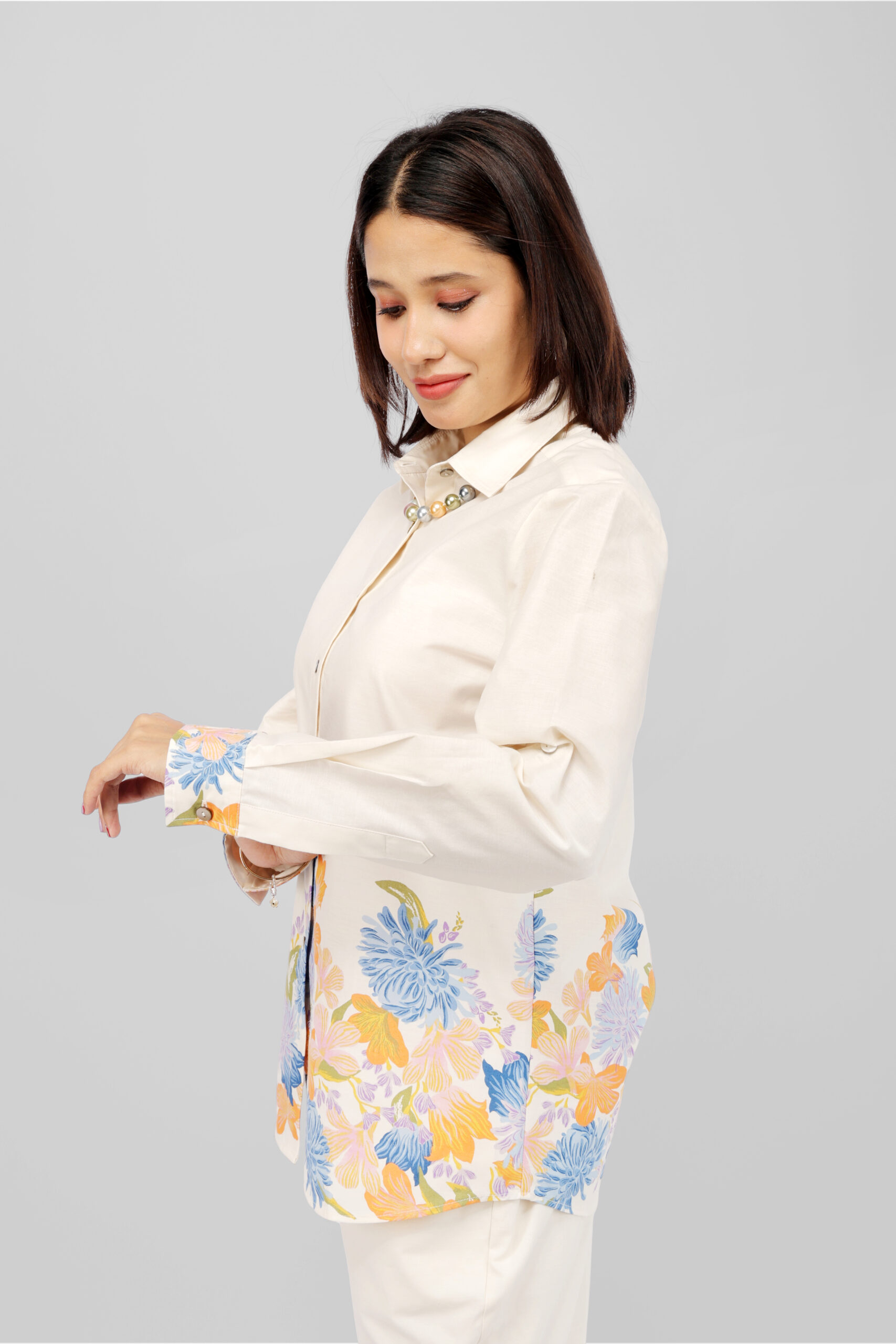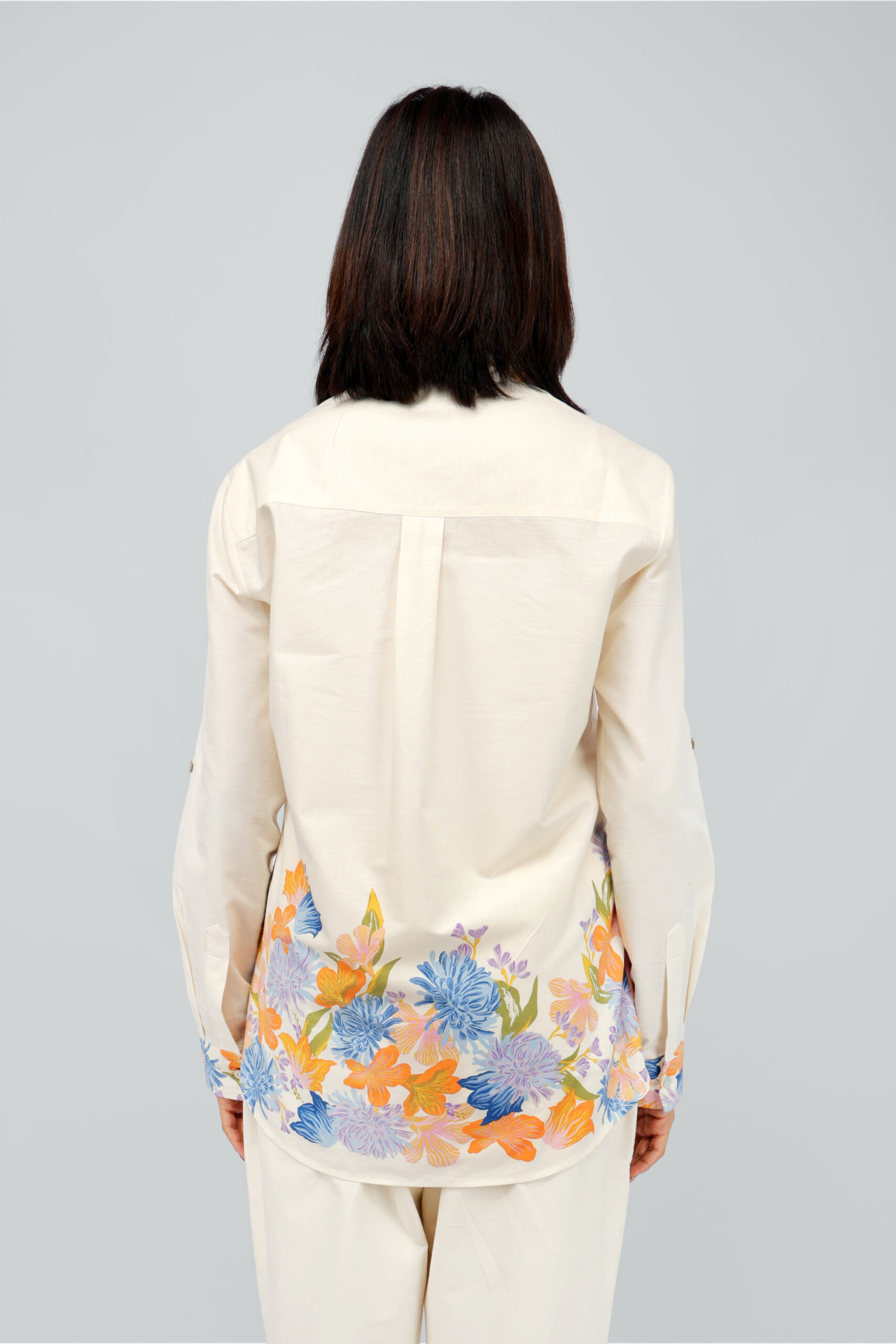 Set on a soothing cream base, the upper yoke is adorned with vibrant orange, blue, and lavender floral motifs, creating a beautiful and graceful contrast. The minimal concealed placket and classic round neckline give the blouse a clean and sophisticated finish, while full-length sleeves with elastic cuffs add both comfort and subtle style.