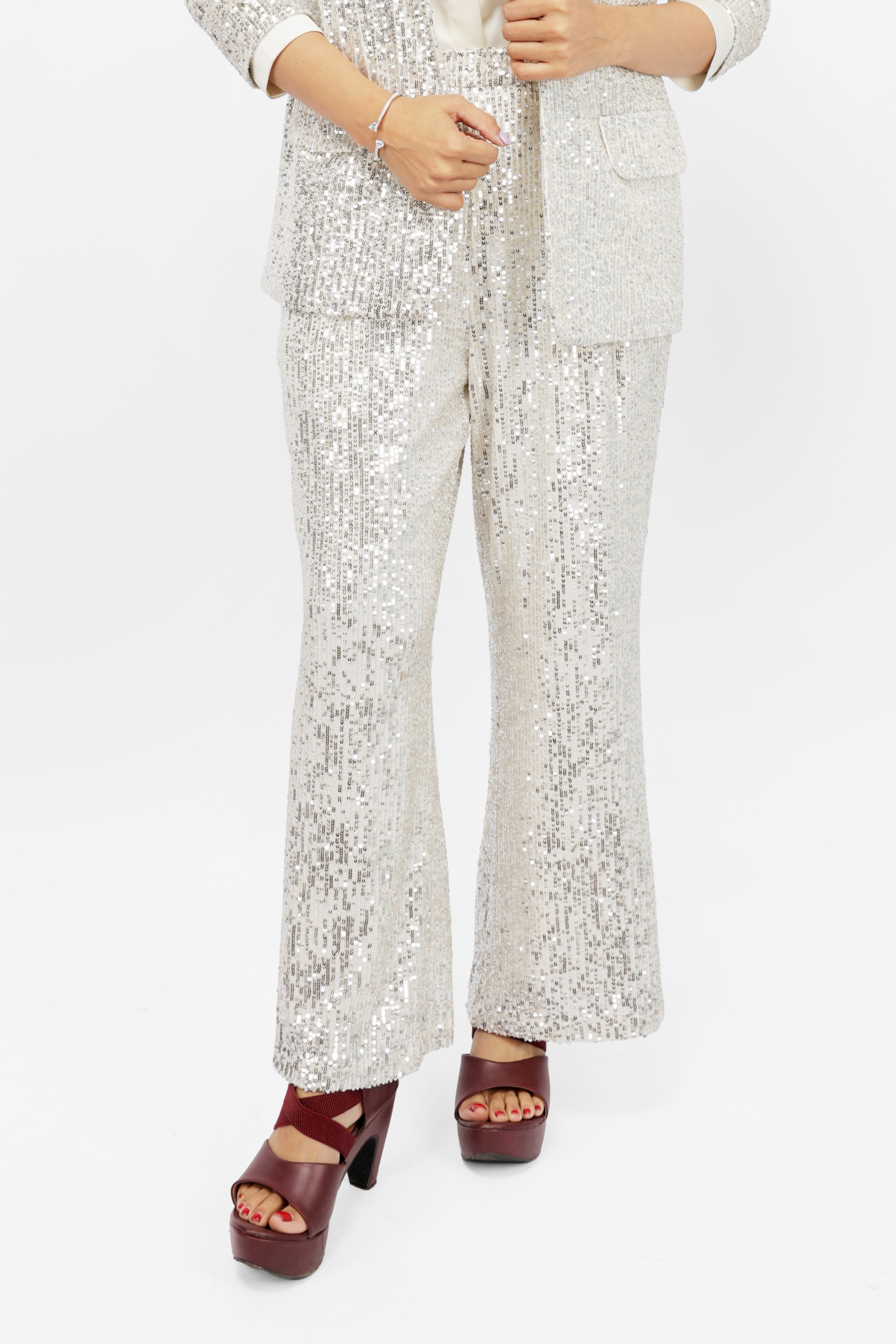 The flattering flared (bell-bottom) silhouette elongates your legs while offering a comfortable and flexible fit. Whether paired with a chic blouse, a statement top, or a stylish jacket, these pants instantly elevate your look for any special occasion. From cocktail parties to evening gatherings, these sequin pants are your go-to choice for making a bold fashion statement.