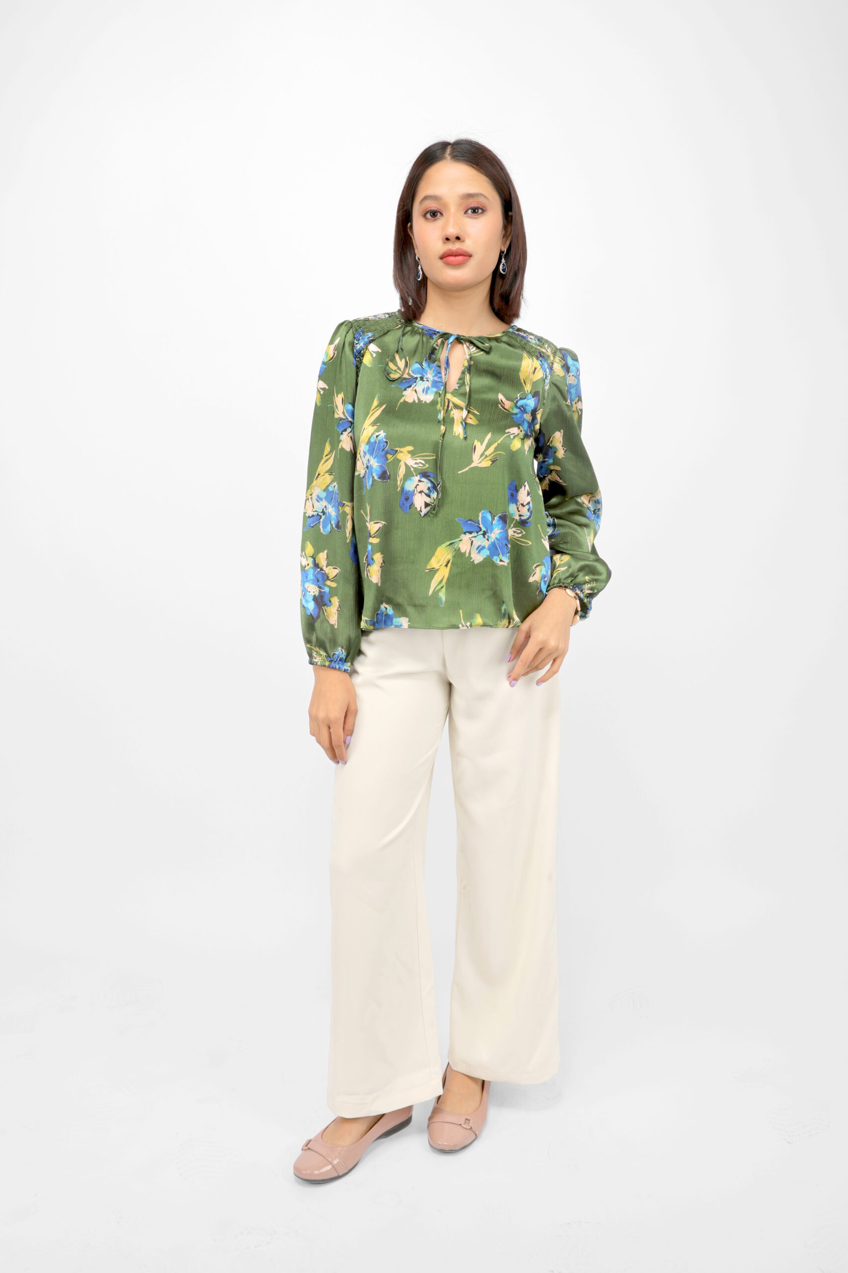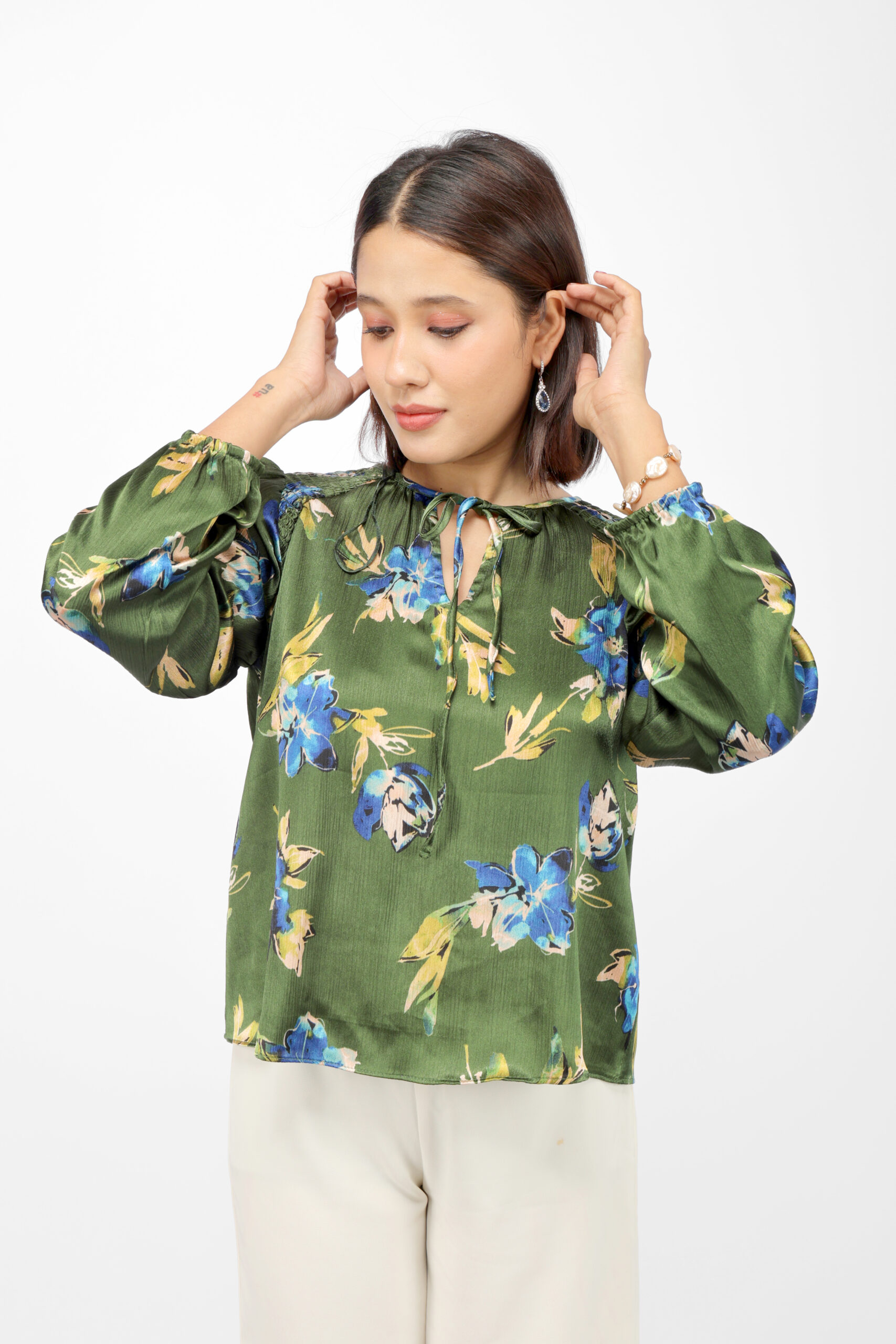 Add a fresh and feminine touch to your wardrobe with this elegant olive green floral top. Designed with a beautifully smocked neckline and tie-up detail, this lightweight top offers both comfort and style. The vibrant blue floral print contrasts gracefully against the rich green base, making it perfect for casual outings, office wear, or weekend gatherings. The long sleeves with elasticated cuffs add a soft, flowy silhouette that flatters all body types.
